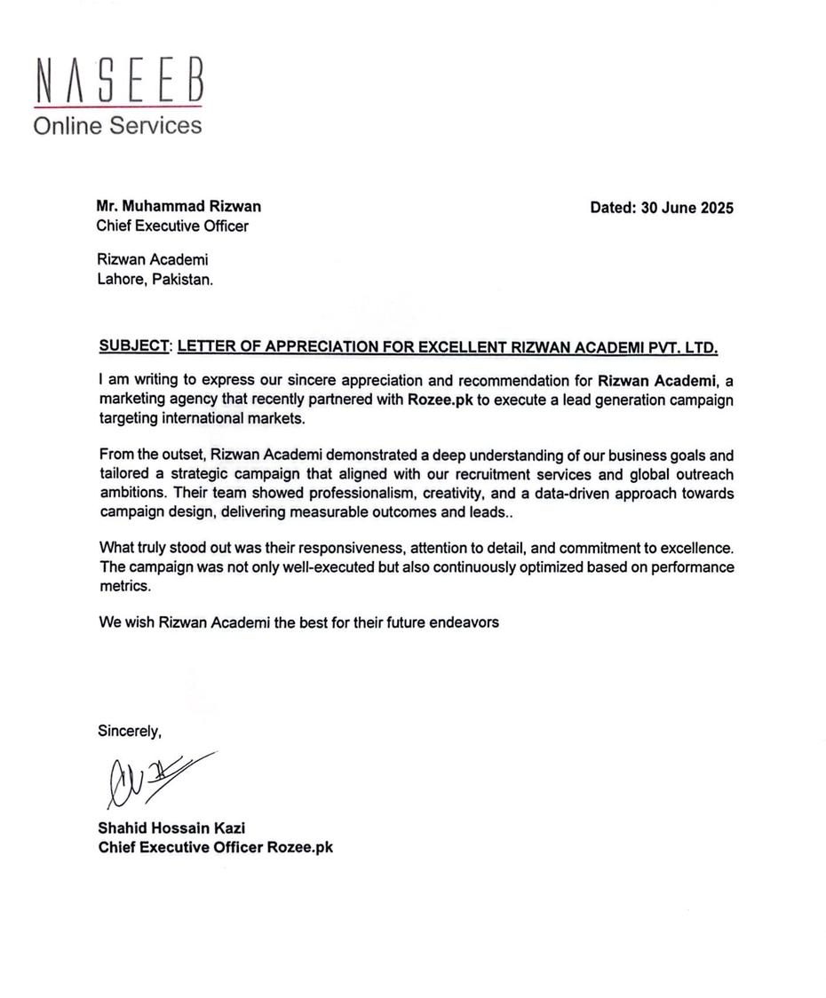 Partnering with Rizwan Academi Pvt. Ltd. for our international lead generation campaign was an excellent experience. Their team deeply understood our business goals and designed a strategic, data-driven campaign aligned with our global recruitment objectives. They demonstrated professionalism, creativity, and consistent optimization based on performance metrics, delivering measurable results. We highly appreciate their responsiveness, attention to detail, and commitment to excellence.